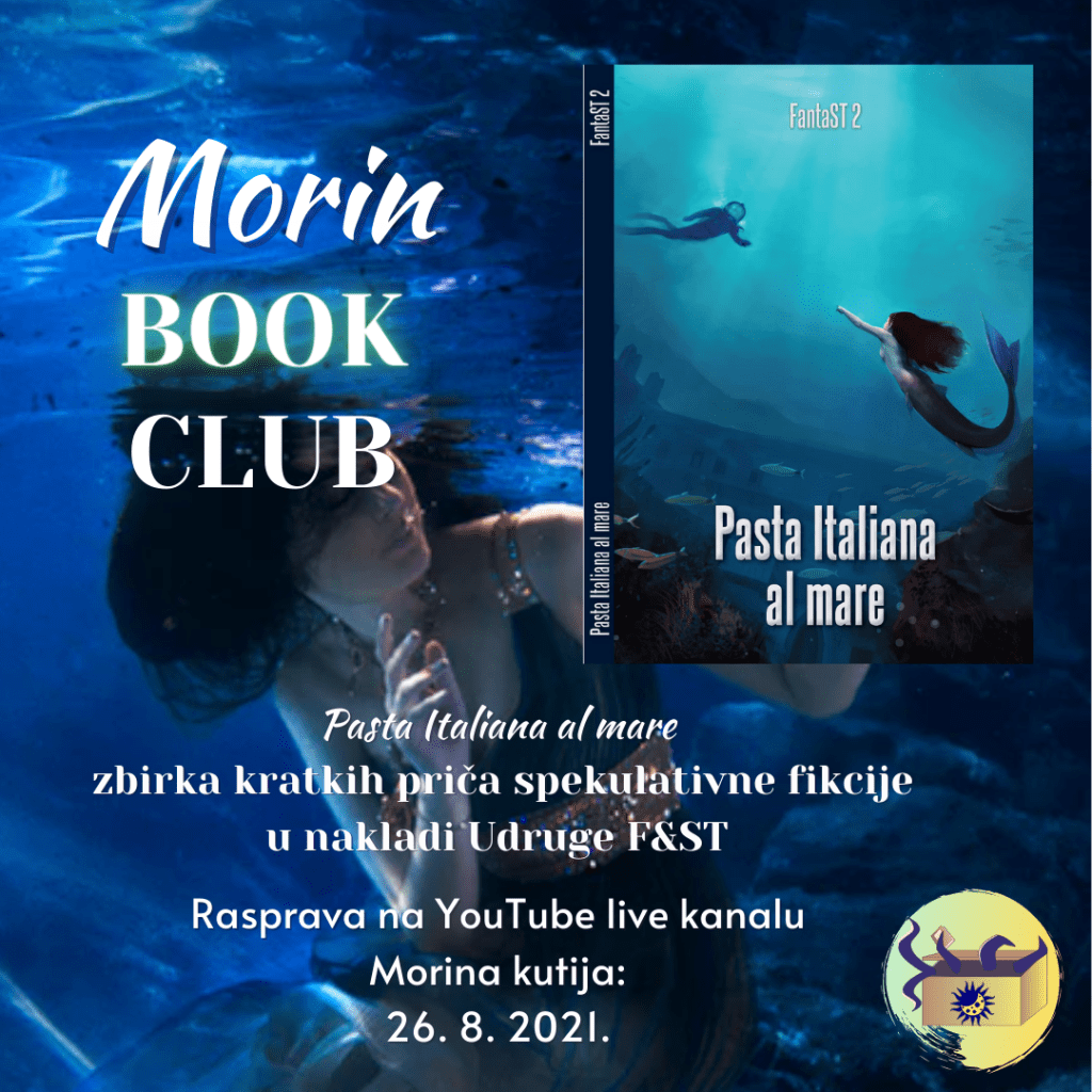Jednom kad zavirite u kutiju, iznenađenjima nema kraja. Morino uredništvo ovaj puta izvlači poziv za online čitateljski klub koji će se odvijati na našem YouTube kanalu. Knjiga koju smo odabrali za čitanje i raspravu je Pasta Italiana al mare – zbirka priča spekulativne fikcije koju objavljuju naši splitski kolege, Udruga za fantastiku, igre i znanstvenu fantastiku F&ST. Zbirka je dostupna online za skidanje, posve besplatno na ovoj poveznici, tako da je možete lako naći. Datum rasprave je četvrtak, 26. kolovoza, u 18:30 sati, dakle za mjesec dana. Taman za čitanje na plaži. 🙂