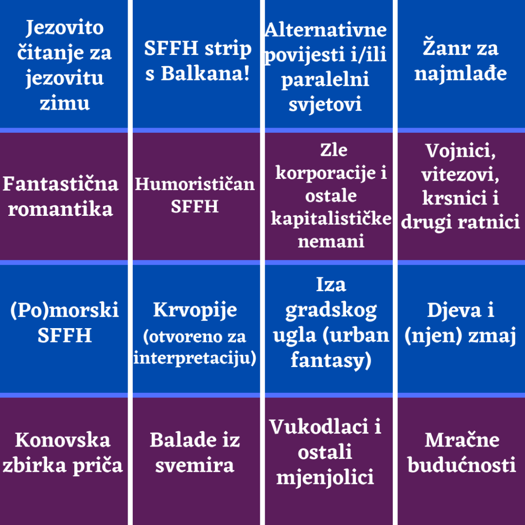 Potrebno je popuniti vodoravni, okomiti ili dijagonalni niz pročitanim knjigama u ovome periodu od 15. 10. do 15. 11. Možete pročitati minimalno jednu knjigu (ako uspijete naći nešto što pokriva niz), ili više knjiga, po vašoj volji i slobodnom vremenu. Potrebno je samo da knjiga bude hrvatskog autora i da pripada žanru spekulativne fikcije (znanstvena fantastika, fantastika i horor ili što smo u bingu koristili kratko kao SFFH). Primjerice, knjiga Nokturno za krpelja Milene Benini može pokriti: Krvopije, Mračne budućnosti, Zle korporacije i ostale kapitalističke nemani, Humoristični SFFH, Jezovito čitanje za jezovitu zimu i Iza gradskog ugla.