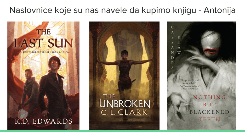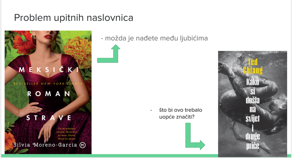 Za početak, imamo kviz s devet naslovnica koji je izbačen iz snimke epizode, ali ostavljamo slajdove, da sami provjerite biste li znali pogoditi žanr po naslovnici. Kojih su žanrova ove knjige?