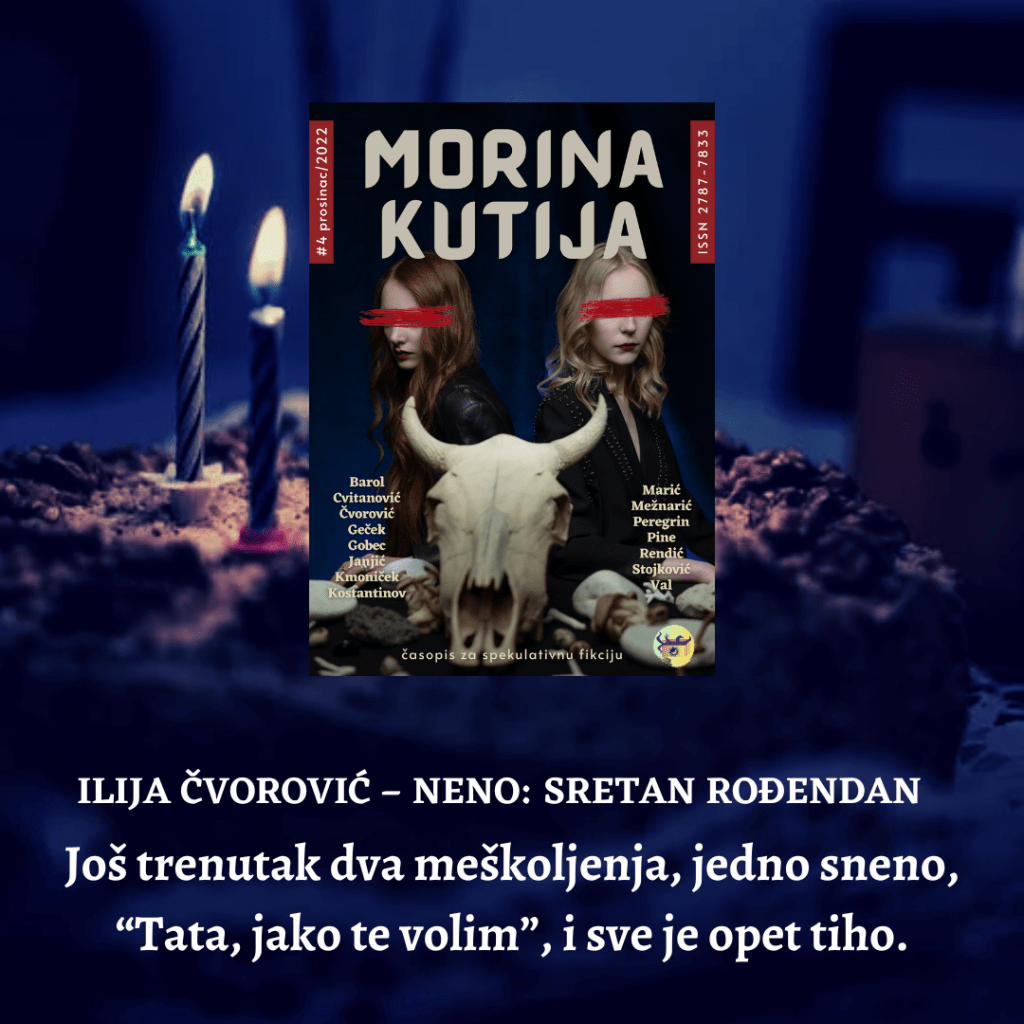 Priča Sretan rođendan objavljena je u online časopisu Morina kutija, br. 4 (prosinac 2022). Časopis možete skinuti ovdje ili s platforme Smashwords.