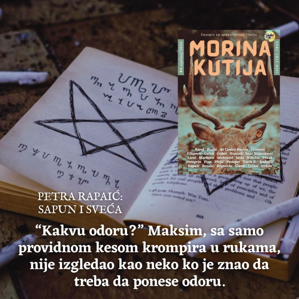 Priča Sapun i sveća objavljena je u online časopisu Morina kutija, br. 6 (siječanj, 2024.). Časopis možete skinuti ovdje ili s platforme Smashwords.
