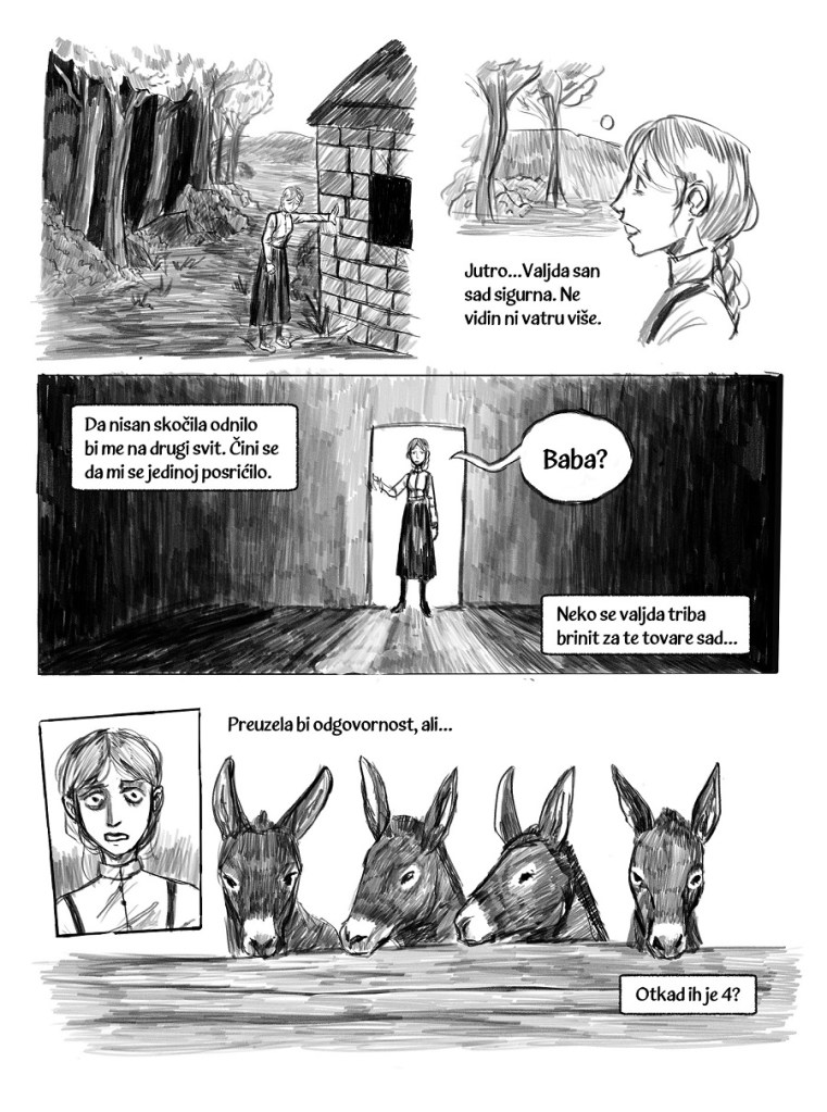 Urednički komentar: U ovom vrlo originalnom stripu inspiriranom folklorom, grayscale digitalni crtež odlično koristi šrafure s čime dobiva jednu posebnu toplinu izraza kojeg je katkad inače teško postići u ovom mediju. Posebna poslastica je dijalekt kojim je strip napisan, koji mu daje još jednu sasvim autentičnu dimenziju.