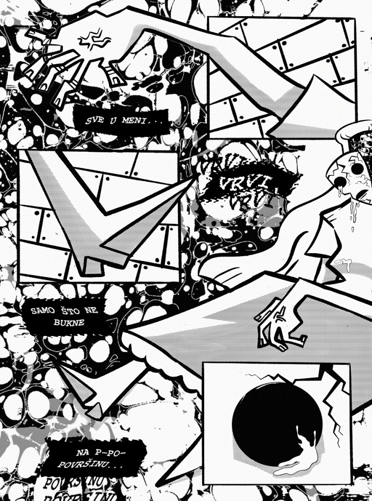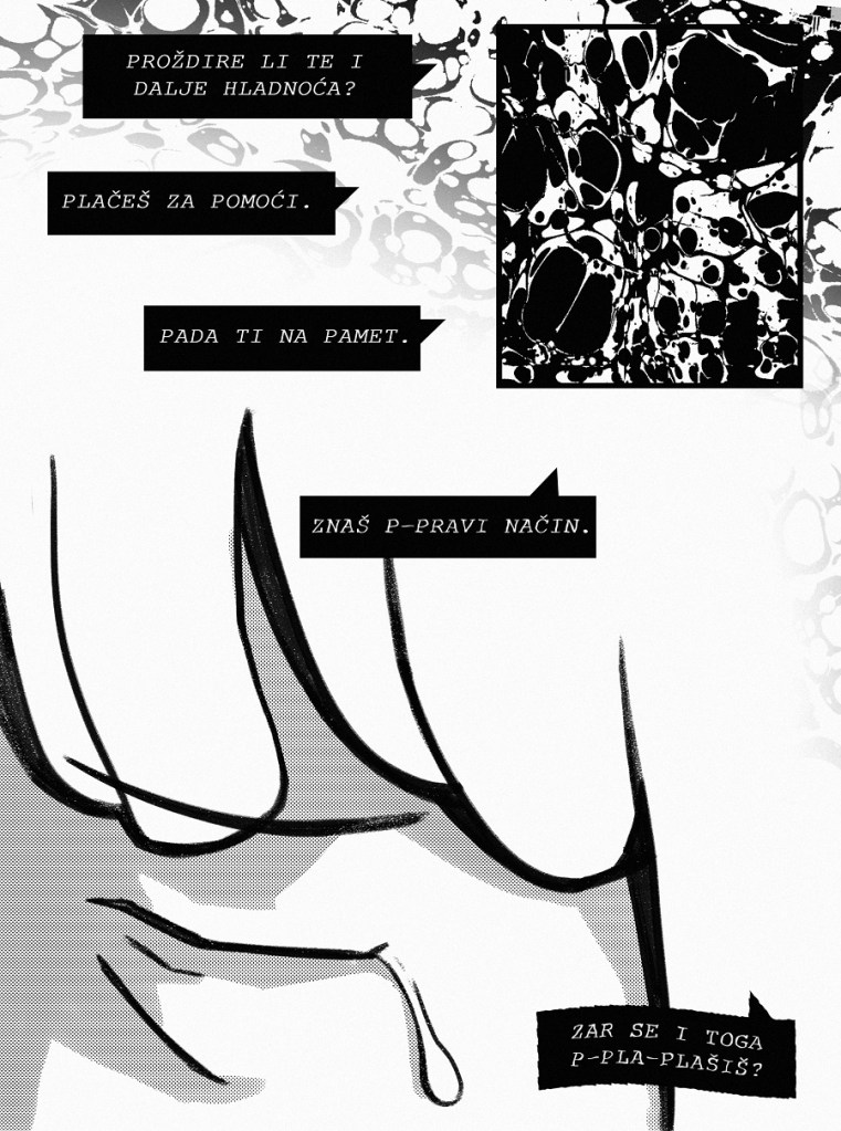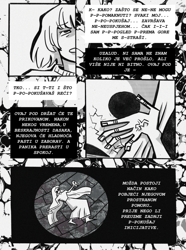 Urednički komentar: Osmostrani psihološki horor koji se fino i polagano razvija kroz priču ispričanu dijalogom, hrabrim kadriranjem i emocionalnim stanjima. Ovaj strip donosi nam jako efektnu suradnju između dvije umjetnice koje su se nadopunjavale i crtežom i pričom. Međusobno, ova dva pristupa jako dobro funkcioniraju stilski i služe kao odlična narativna tehnika.