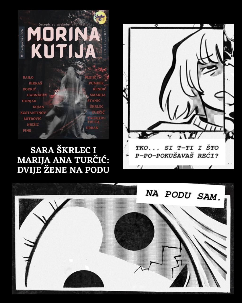 Strip Dvije žene na podu objavljen je u online časopisu Morina kutija, br. 10 (veljača, 2026.). Časopis možete besplatno preuzeti s morinakutija.com/mag ili s platforme Smashwords.