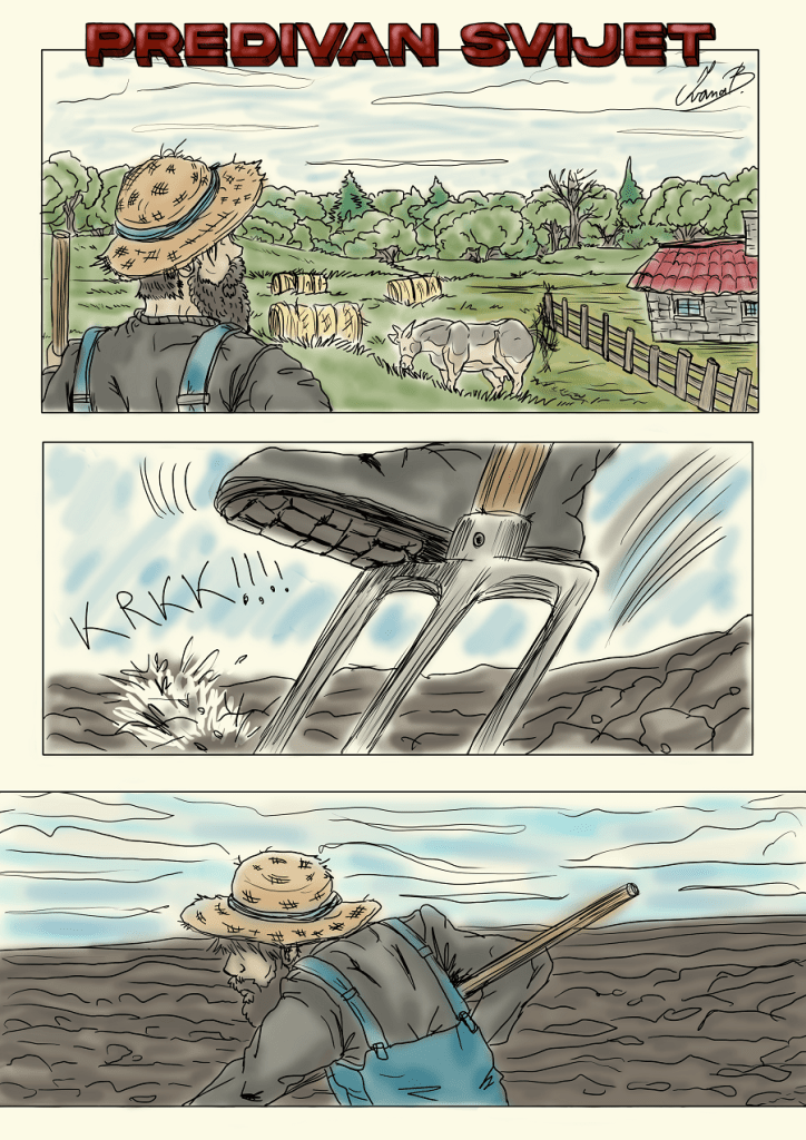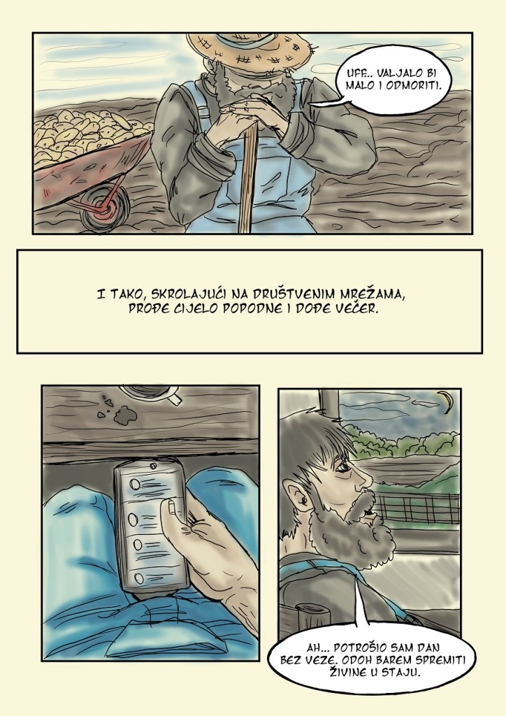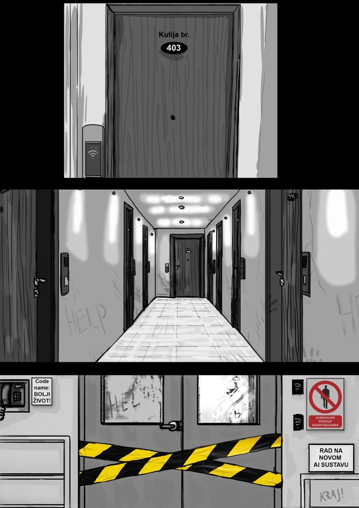 Urednički komentar: Ivana Birkaš dala nam je strip za ljubitelje “Black mirror” serije i kao takav moćna je crtica o potencijalnoj distopiji koja nas čeka. Posebno se ističe digitalni crtež s liričnom šrafurom i odličnom promjenom palete na pola stripa koja ima veliku narativnu težinu te super kontrola kadriranja prostora scene u službi priče.