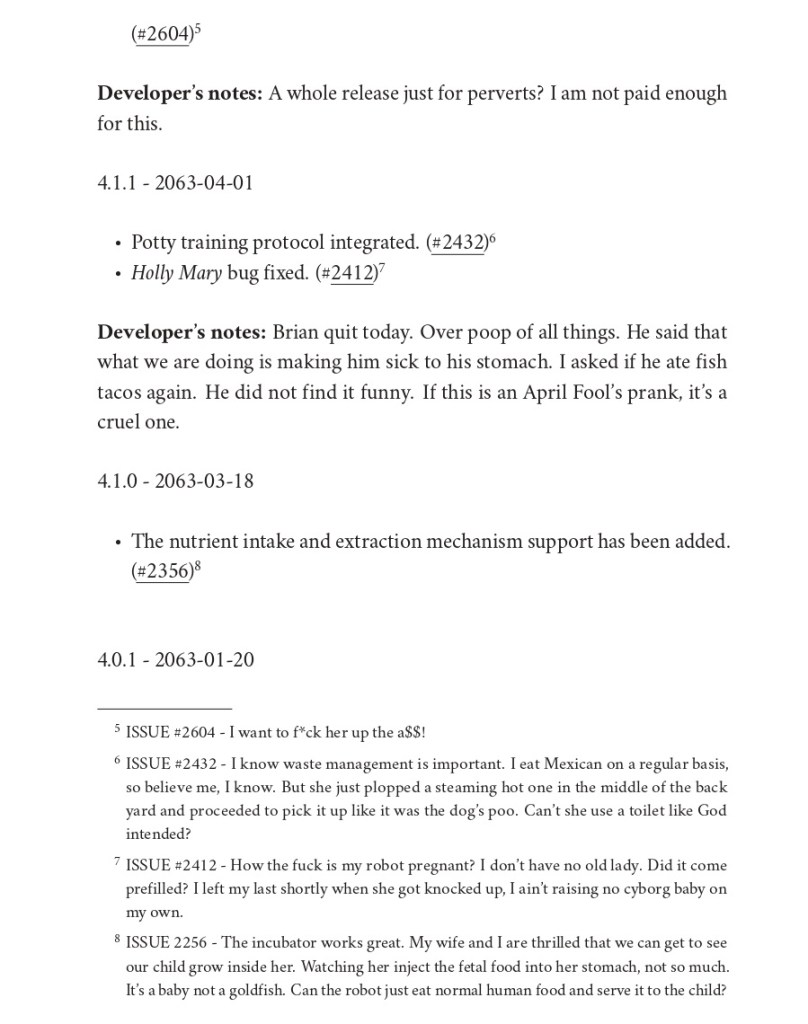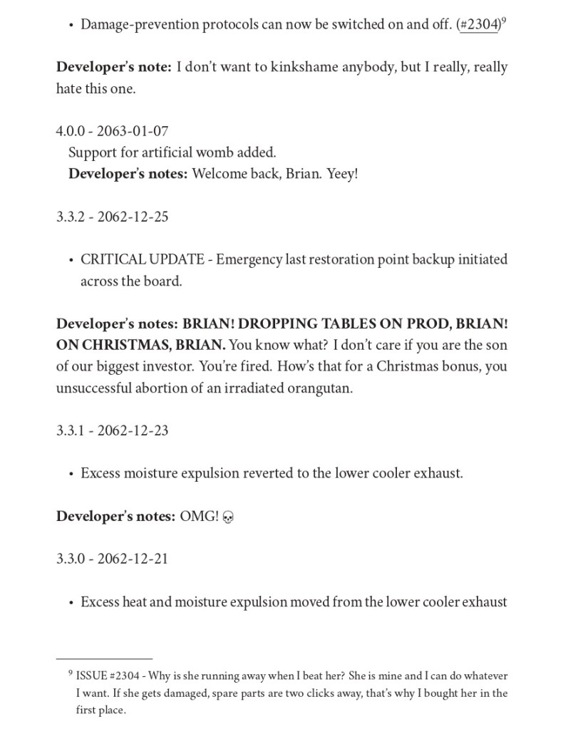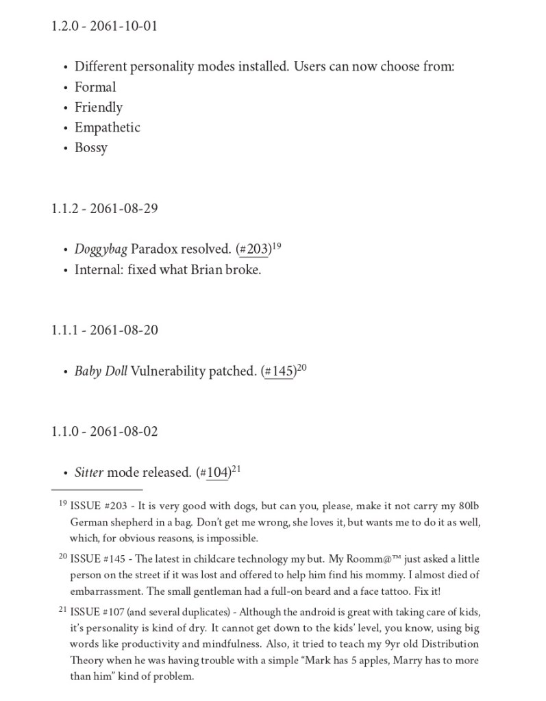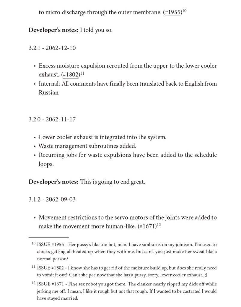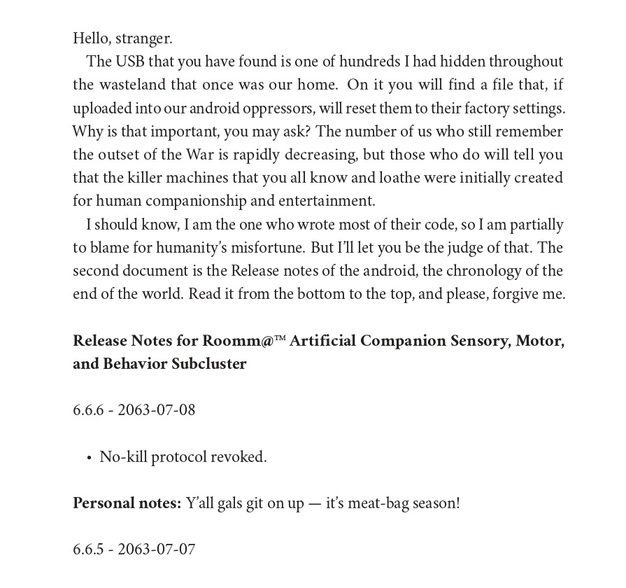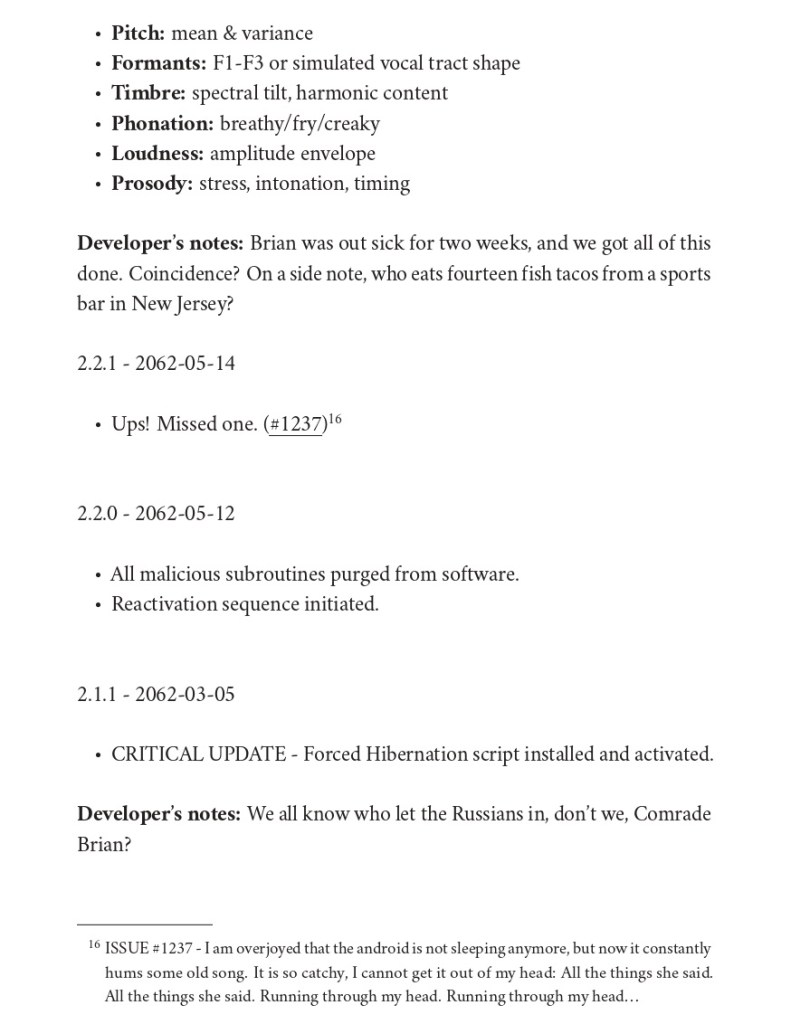 Urednički komentar: Odlično poigravanje formom kojom nam autor poznate znanstvenofantastične motive i (dosta aktualnu) problematiku prenosi na novi i zabavan način koji nas je oduševio. Kroz projektne bilješke kojima pratimo razvoj radnje dobivamo uvid u likove, svijet i satiru koja će nas nasmijati makar bila gorka.